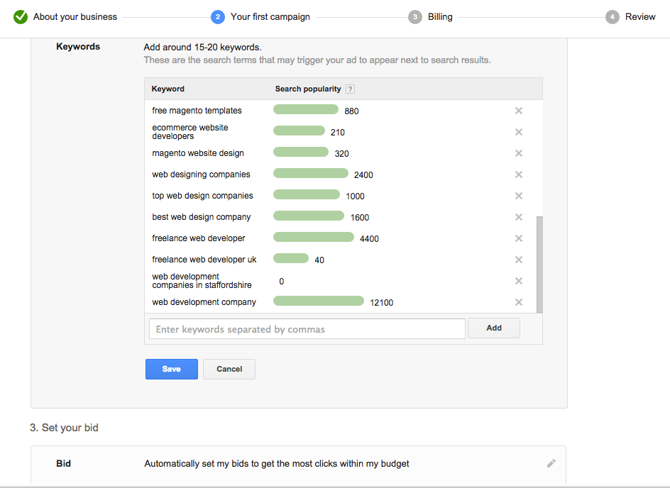 There were some surprises here. When I first started to think about optimisisng this page I was going to use ‘web developers in staffordshire’ as my term. When I checked this in the google keyword tool it suggested I’d get no impressions on that term.